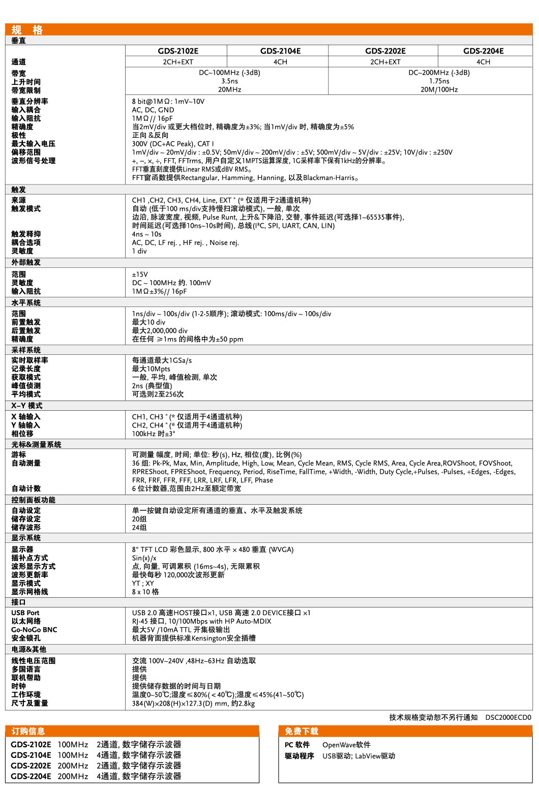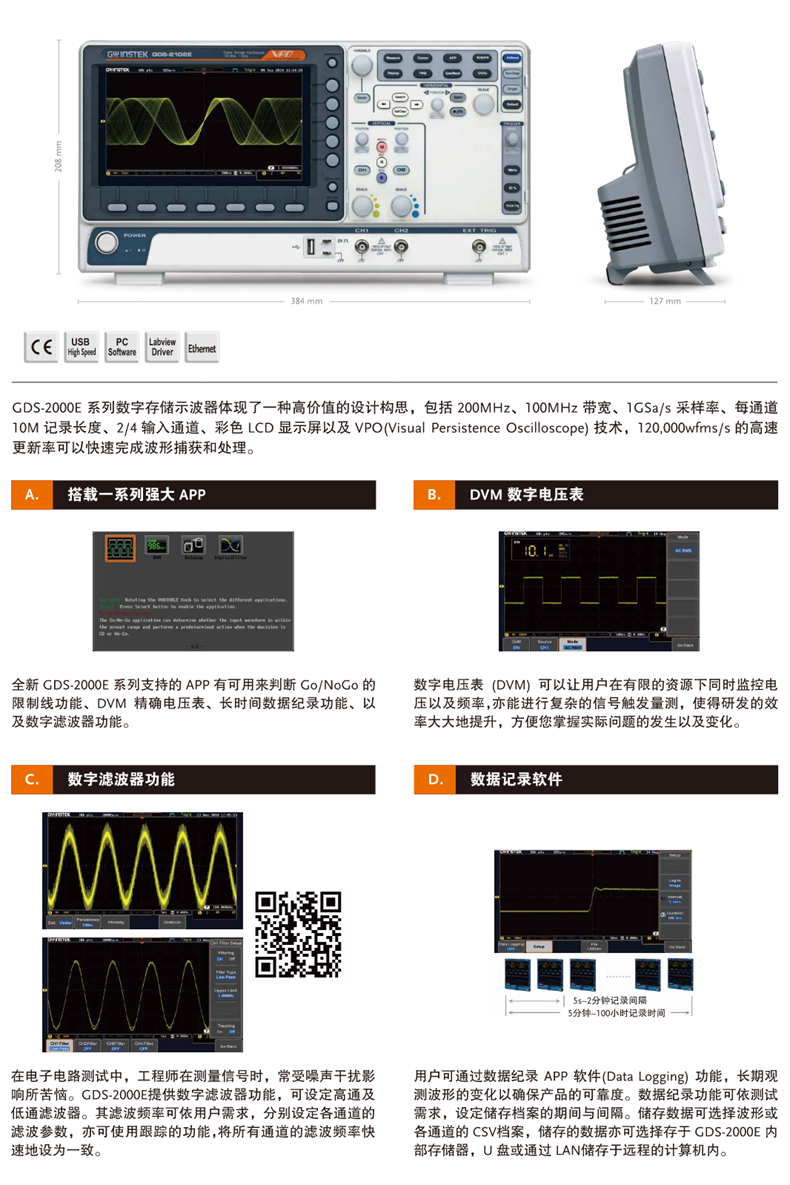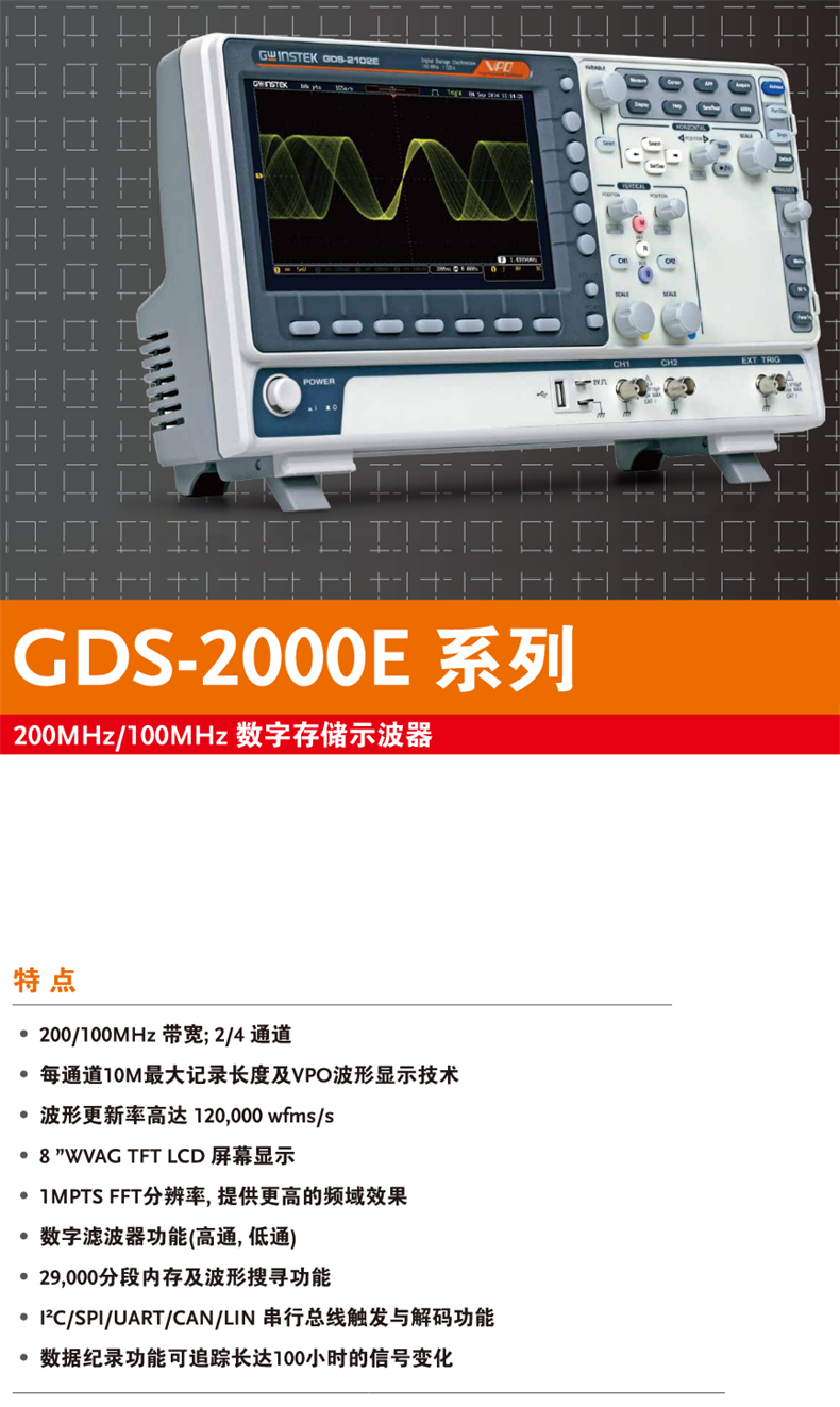 固纬GDS-2204E数字存储示波器200MHz/100MHz带宽带宽选择2/4通道
