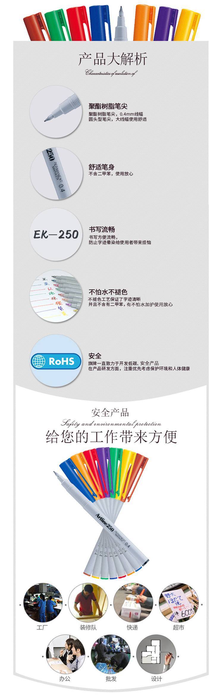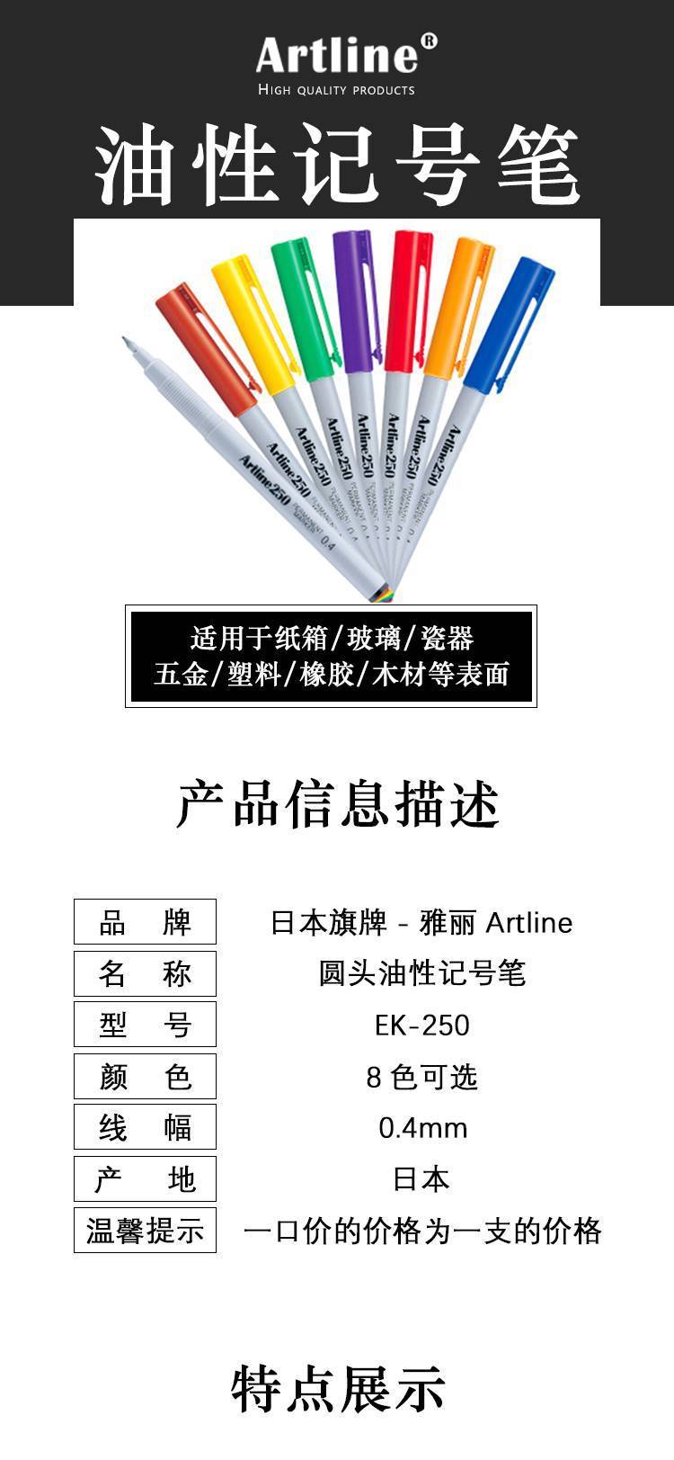 日本旗牌雅丽Artline油性记号笔勾线笔彩色马克笔划线笔EK-250