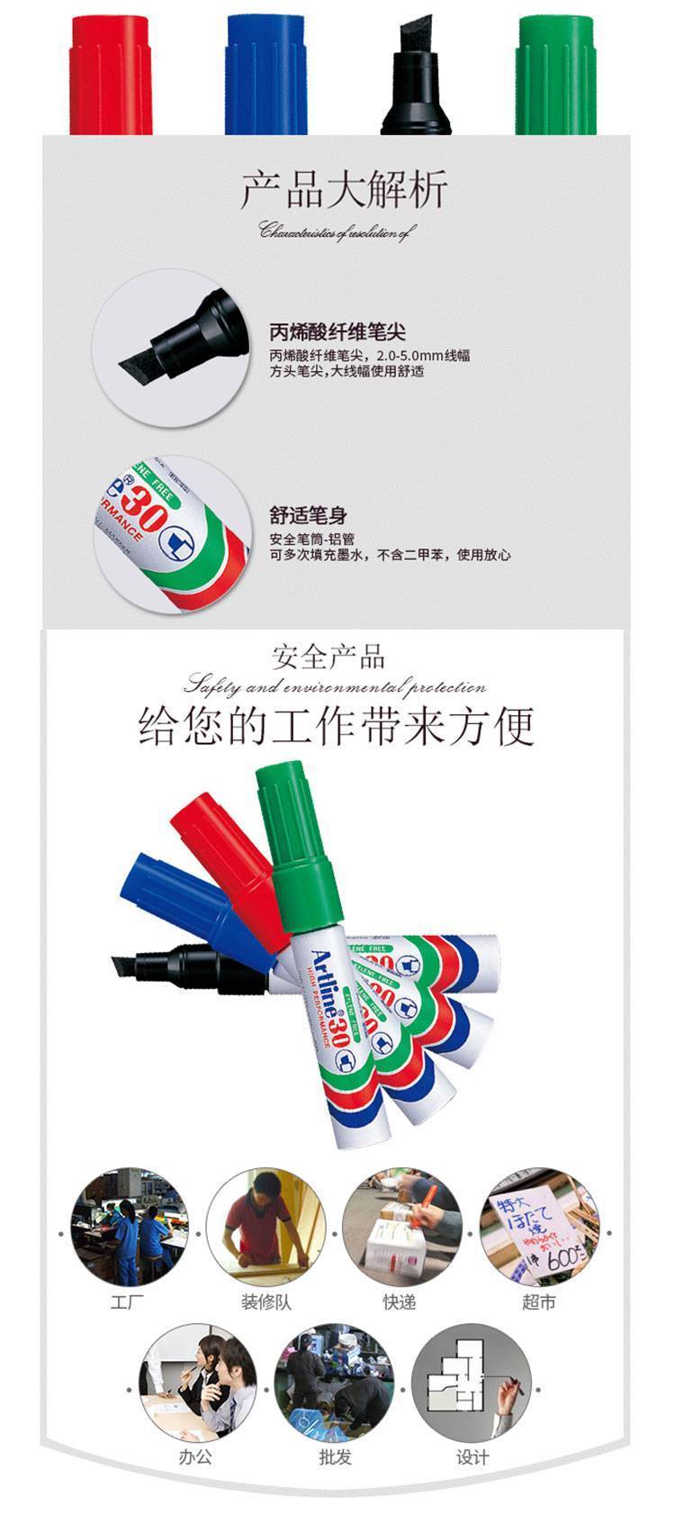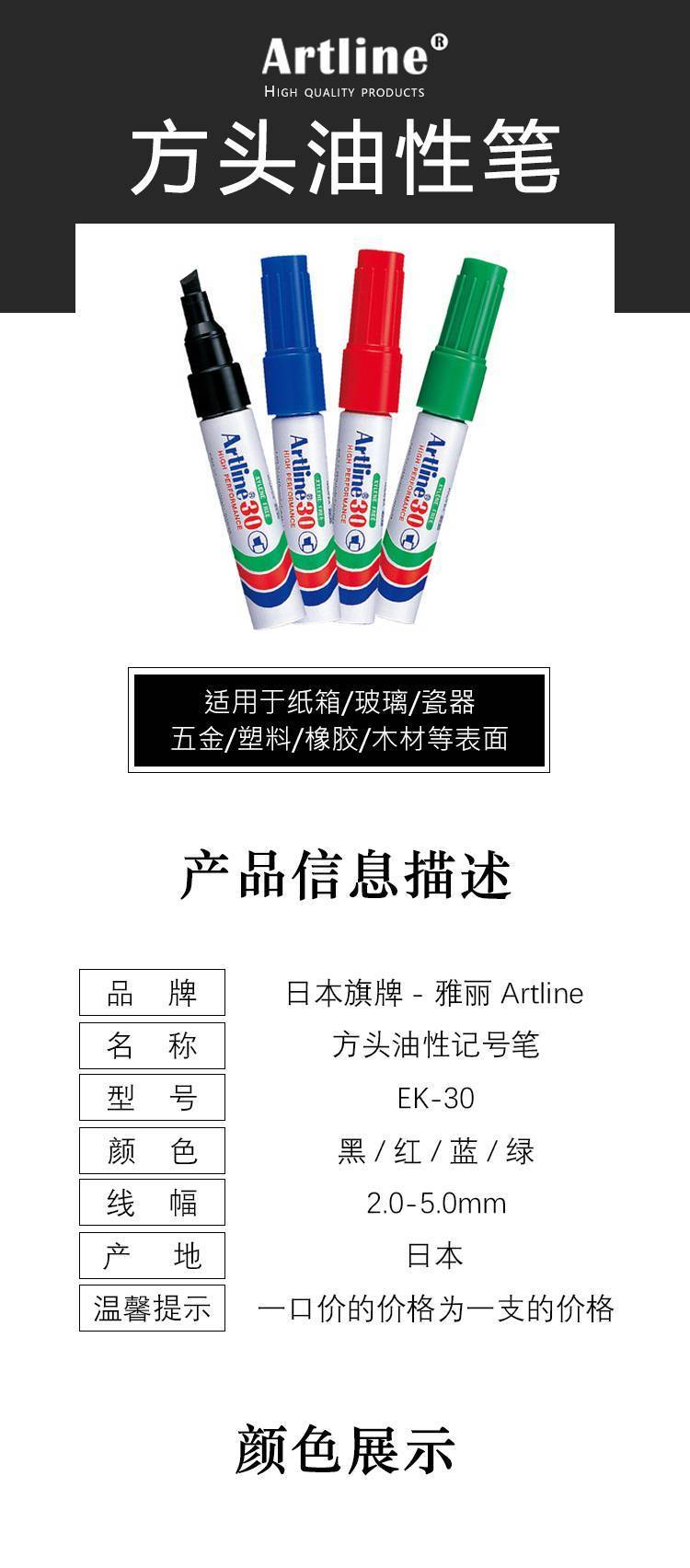 日本旗牌Artline粗头记号笔油性防水速干不掉色方头2-5mm海报笔马克笔pop笔唛克笔可加墨水EK-30