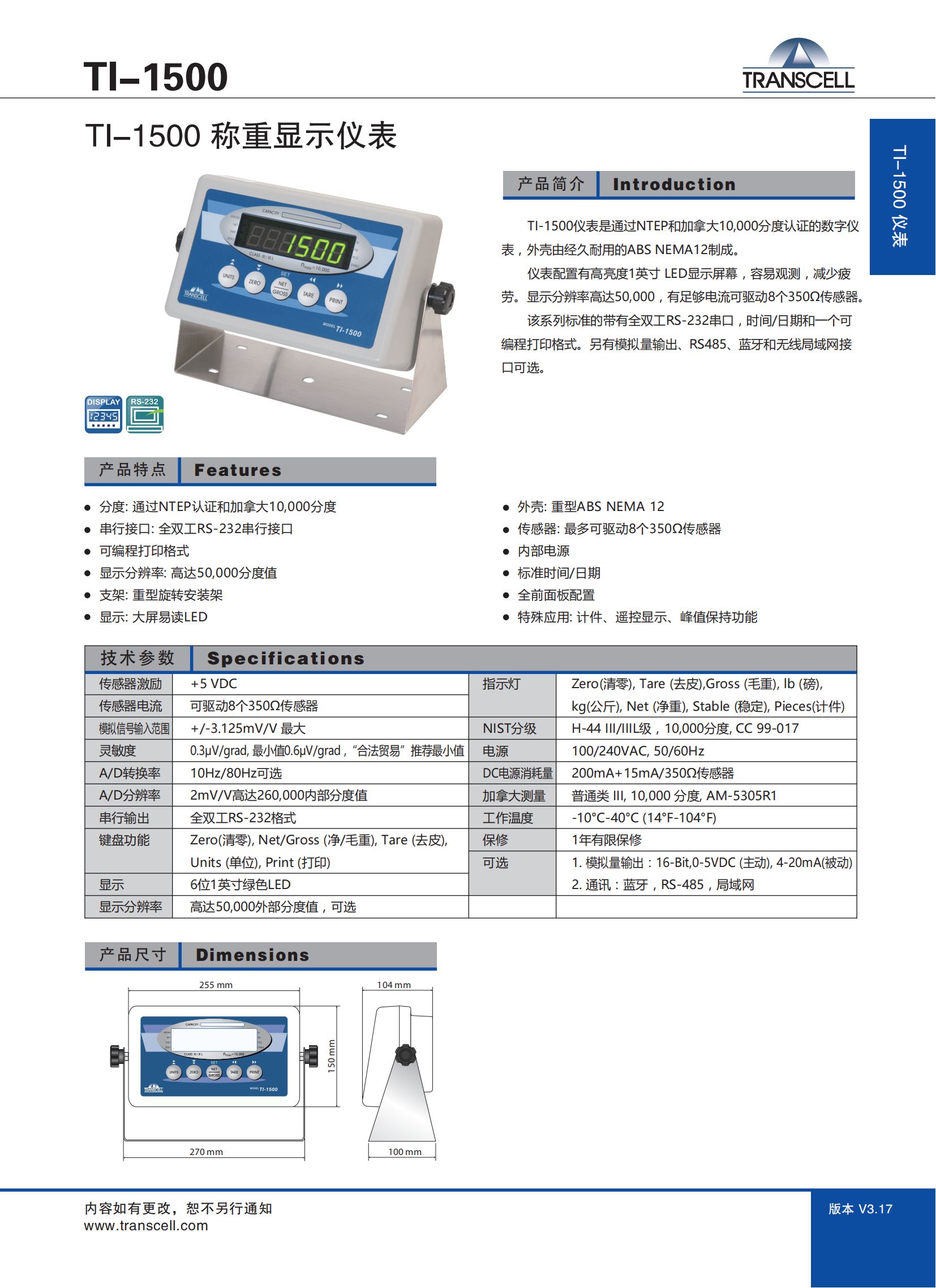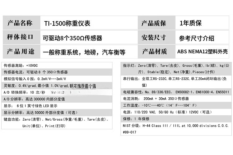 美国Transcell传力 TI-1500 称重控制器 模拟汽车衡仪表