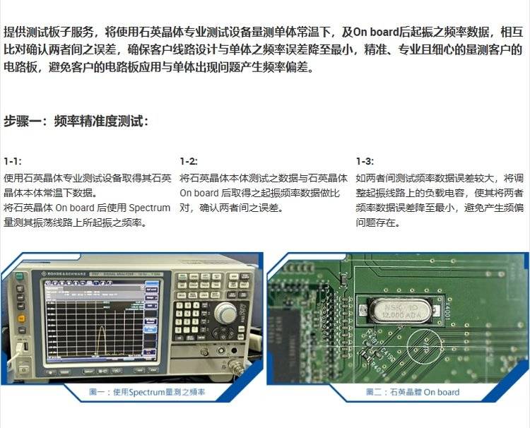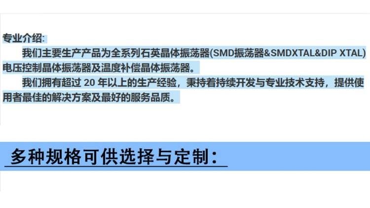 晶体振荡器的体积与封装:产品测试数据:石英晶体搭配线路设计:石英晶体与振荡回路搭配性:制造程序:公司实力