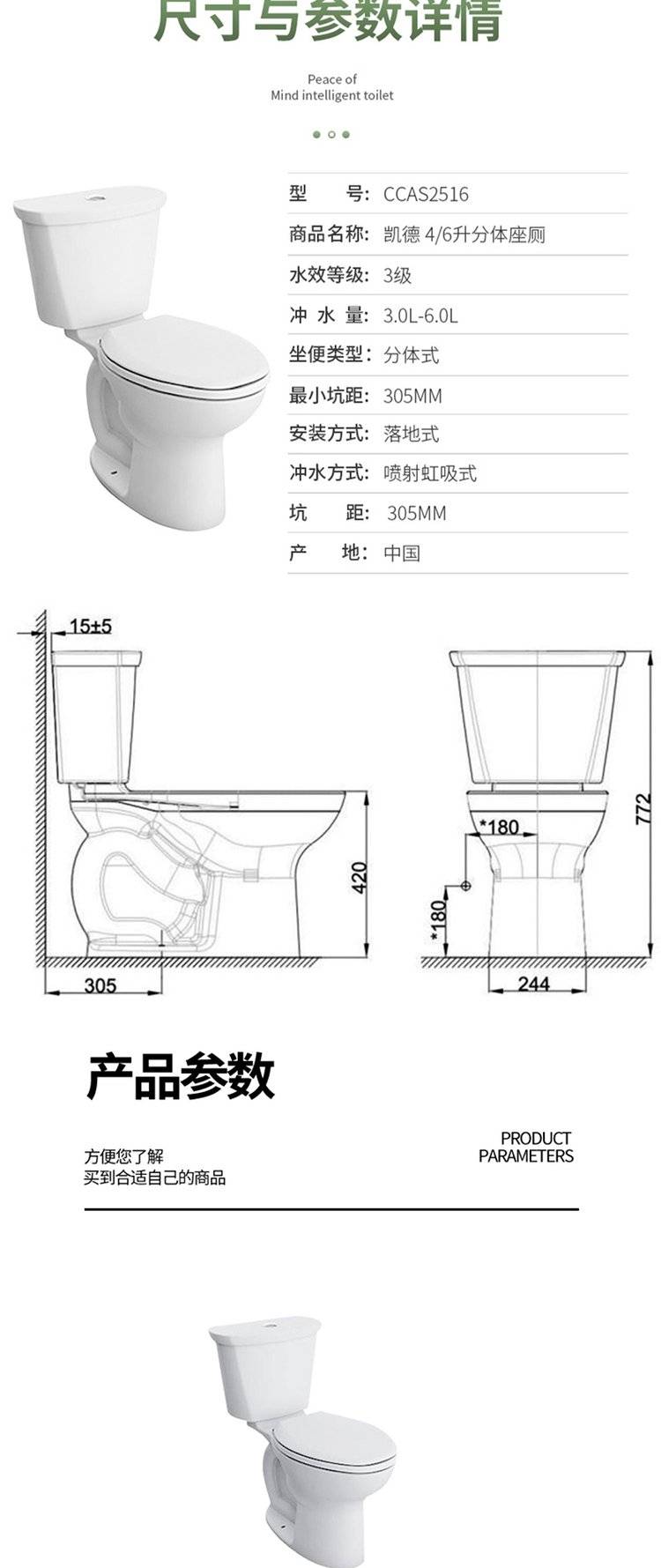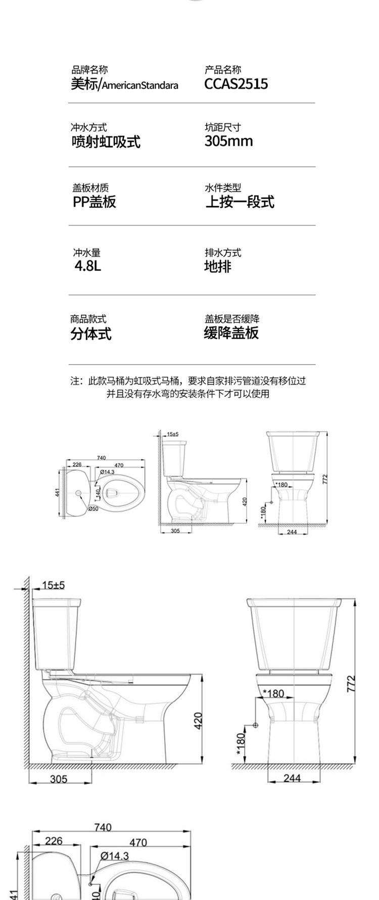 美标卫浴凯德2515节水型分体马桶坐便器家用座厕冲落式冲水缓降盖