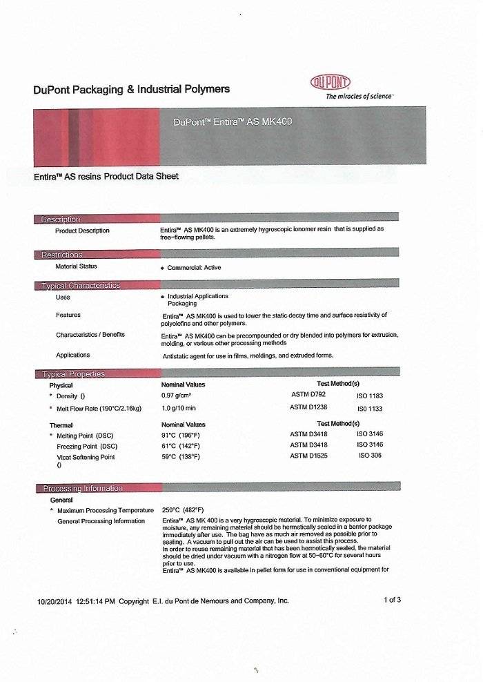 供应美国杜邦MK400 AS离聚物 抗静电剂 长效型抗静电母粒