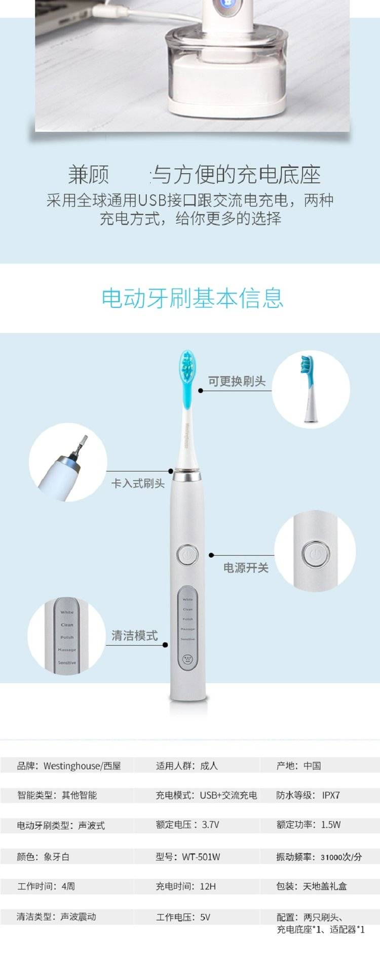 西屋 电动牙刷 WT-501W 懂礼员工礼品 MY-ZPYD-(T)-93