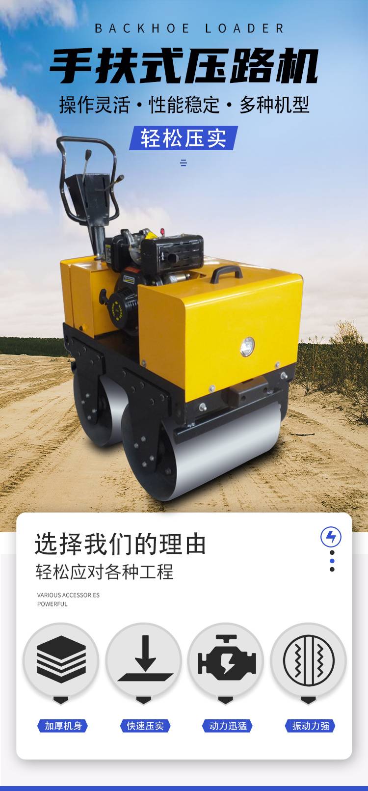 A small 3. 5-ton roller, a lawn-painter, a vibrating backfilling machine