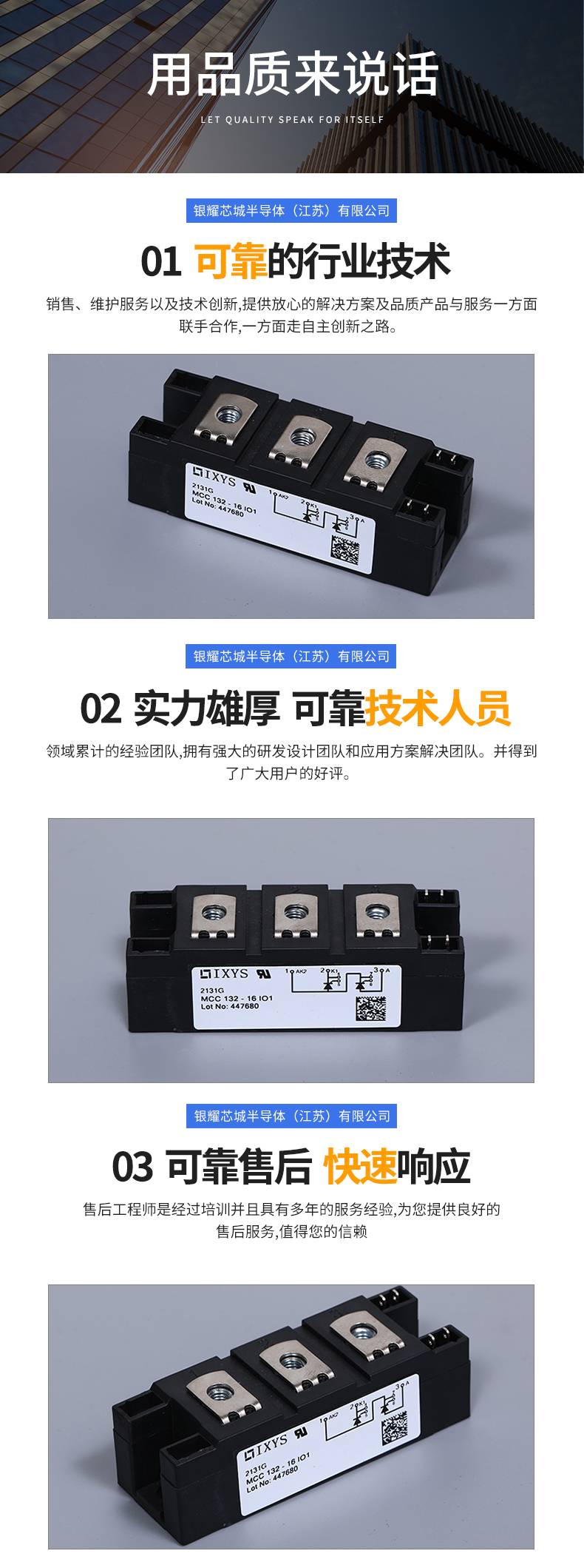 银耀芯城半导体(江苏)有限公司产品系列齐全,技术力量雄厚,售后服务到位,供货稳定,在国内外机电行业中建立了良好的信誉;产品广泛用于开关电源,工控设备,变频器,电焊机,电梯,空调,风力发电,不间断电源,电动力机车,汽车等各方面领域。主要专营: IGBT模块零售/批发:英飞凌,艾赛斯,西门康,中车,三社,罗兰,巴