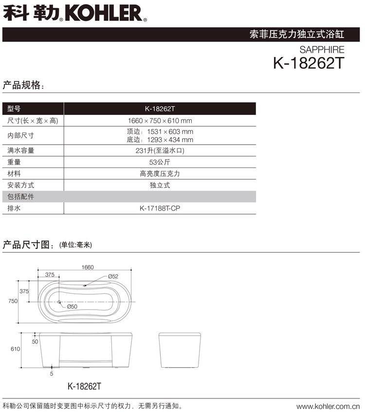 科勒K-18262T独立式浴缸 家用小户型亚克力浴盆 白色