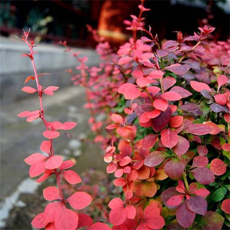 红叶小檗 叶色发紫喜冷凉湿润及阳光充足的环境可做绿篱