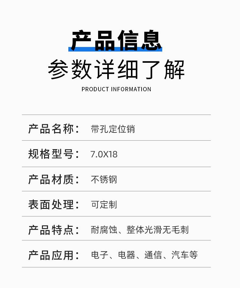 厂家供应 精密圆柱销 7.0×18带孔定位销 304不锈钢材质 支持按需定制
