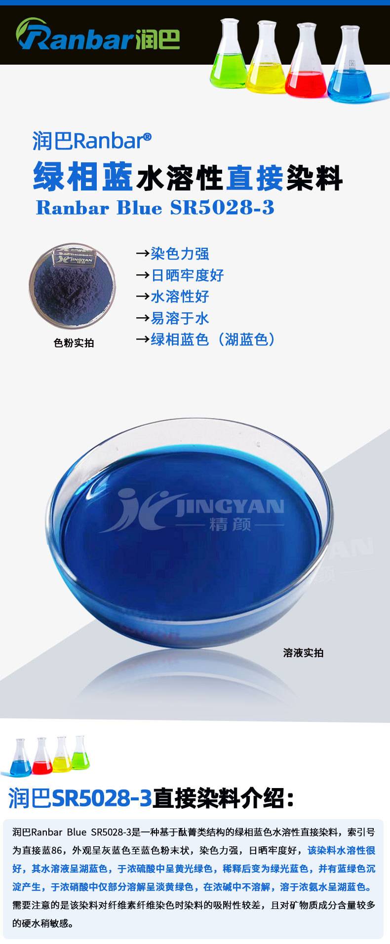 2222酞菁类水溶性直接染料Ranbar Blue SR5028-3水溶染料润巴直接蓝86