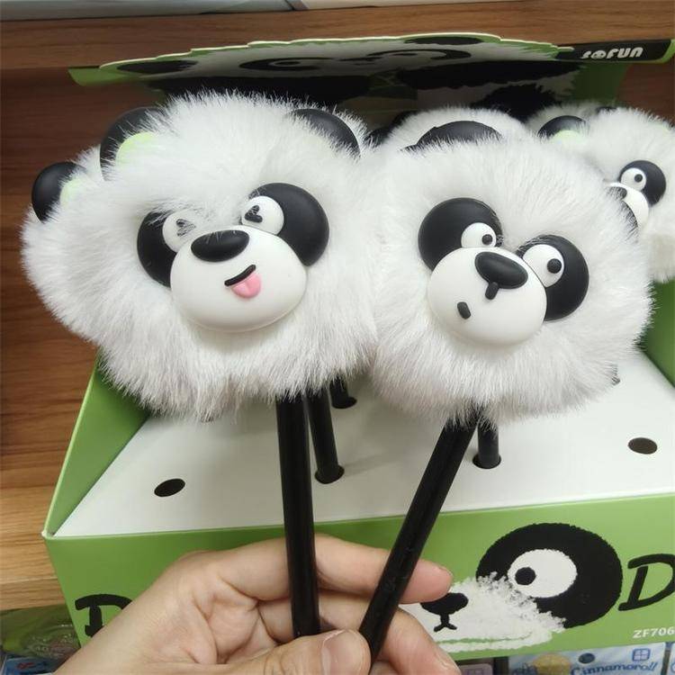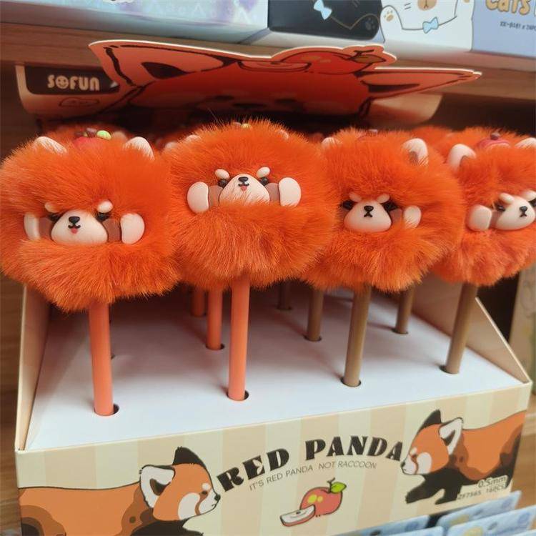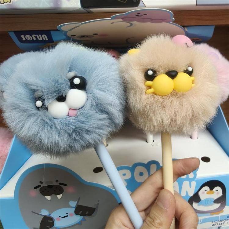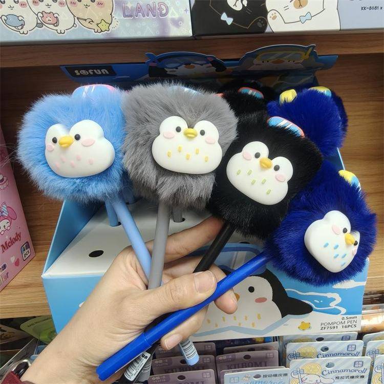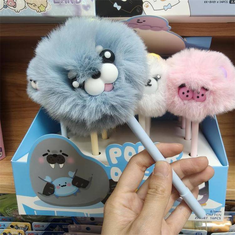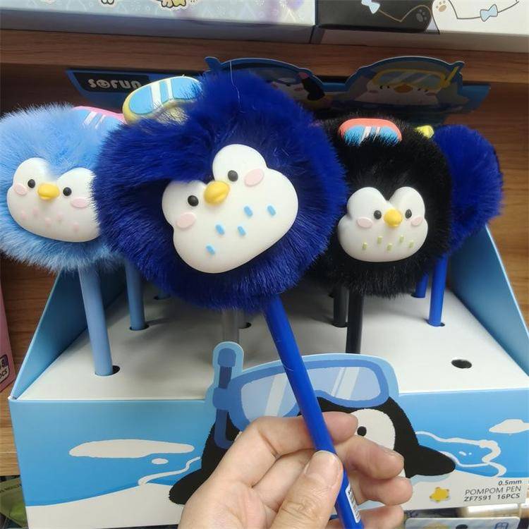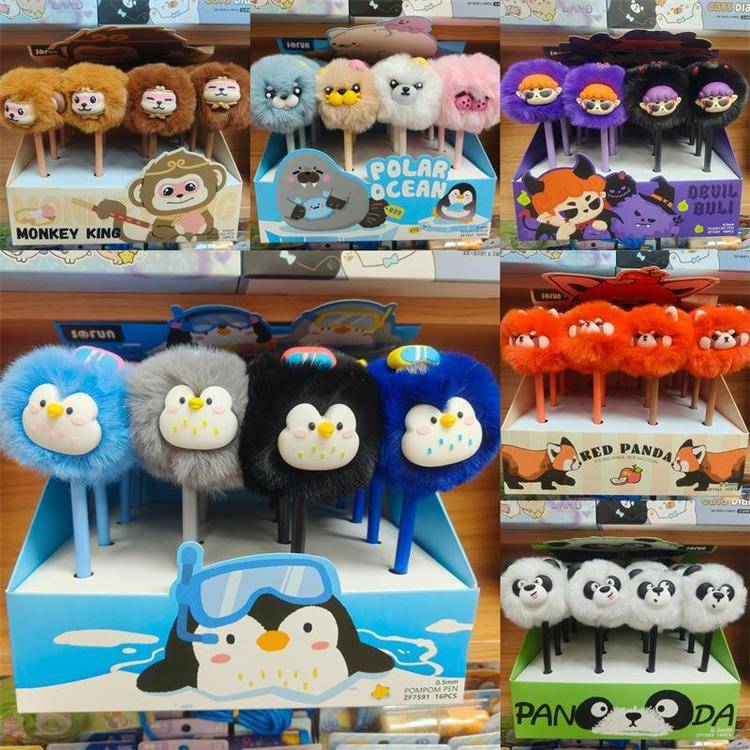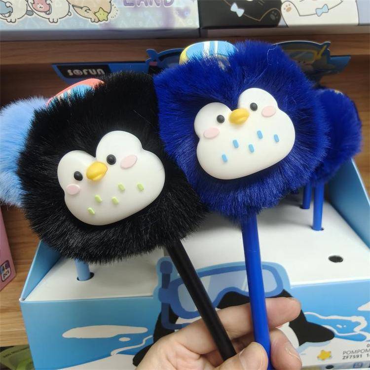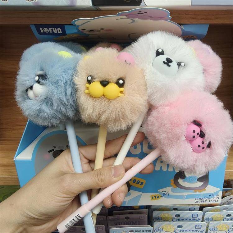 外贸海洋动物萌宠企鹅海豹毛球中性笔熊猫狐狸猴子毛茸茸水笔礼品