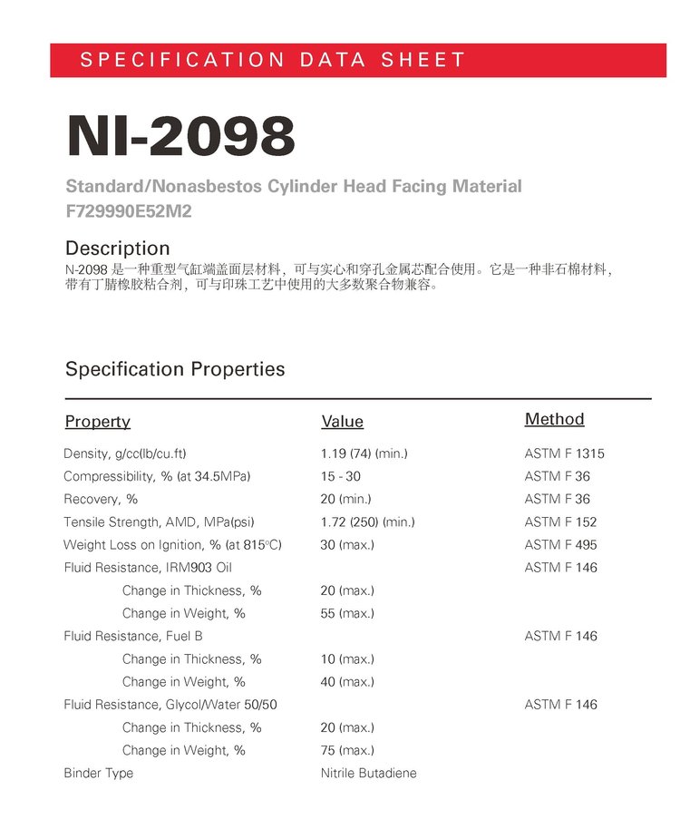 Non-asbestos sealing material for interface intex ni-2098 heavy cylinder cover