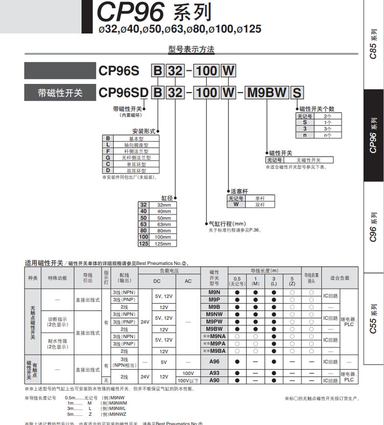 Cp96 standard cylinder single-barrel dual-role cylinderCompatible with iso specifications, buffer valves are easy to regulate, with cnomo slots on all four sides, and -m9 □, a9 □ slots. Cp96 sd series with magnetic switches: cp96sd, cp96kd