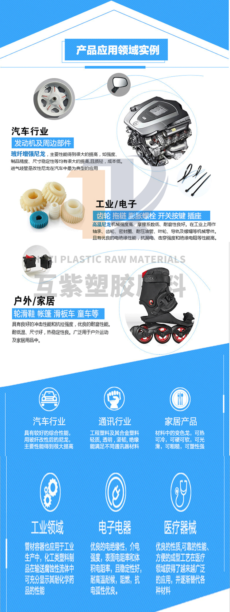 Automobile parts, electrical and electronic parts, sports equipment, household electrical parts