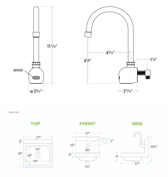 Food cropflow rate 2. 2 gpmmmmatrial bras mounting holes requied 1 mounting holemounting steel wall mounted power typeac adapterbatterypressure 60 psispoutclarance 6/8 inchessput type goosenecktemperature rating 194 degrees fahrenheittype touchles faucetswater inlet size 3/8 inches