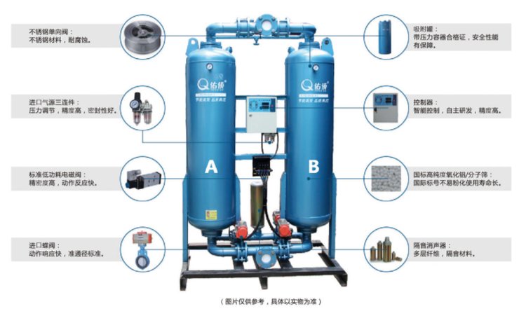 Thermogenic dryers are a device for drying the compressed air based on the principle of volatilisation, so that the compressed air is dryed, partially pumped with dry compressed air when the pressure is reduced, so that the absorbent is regenerated, the two towers rotate, and so that the dry compressed air is recycled, and different adsorbents are selected, depending on the pressure point of the compressed air, with active aluminium oxide, molecular screening, etc。