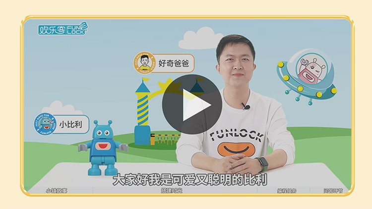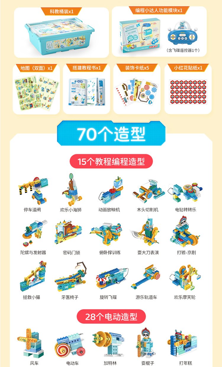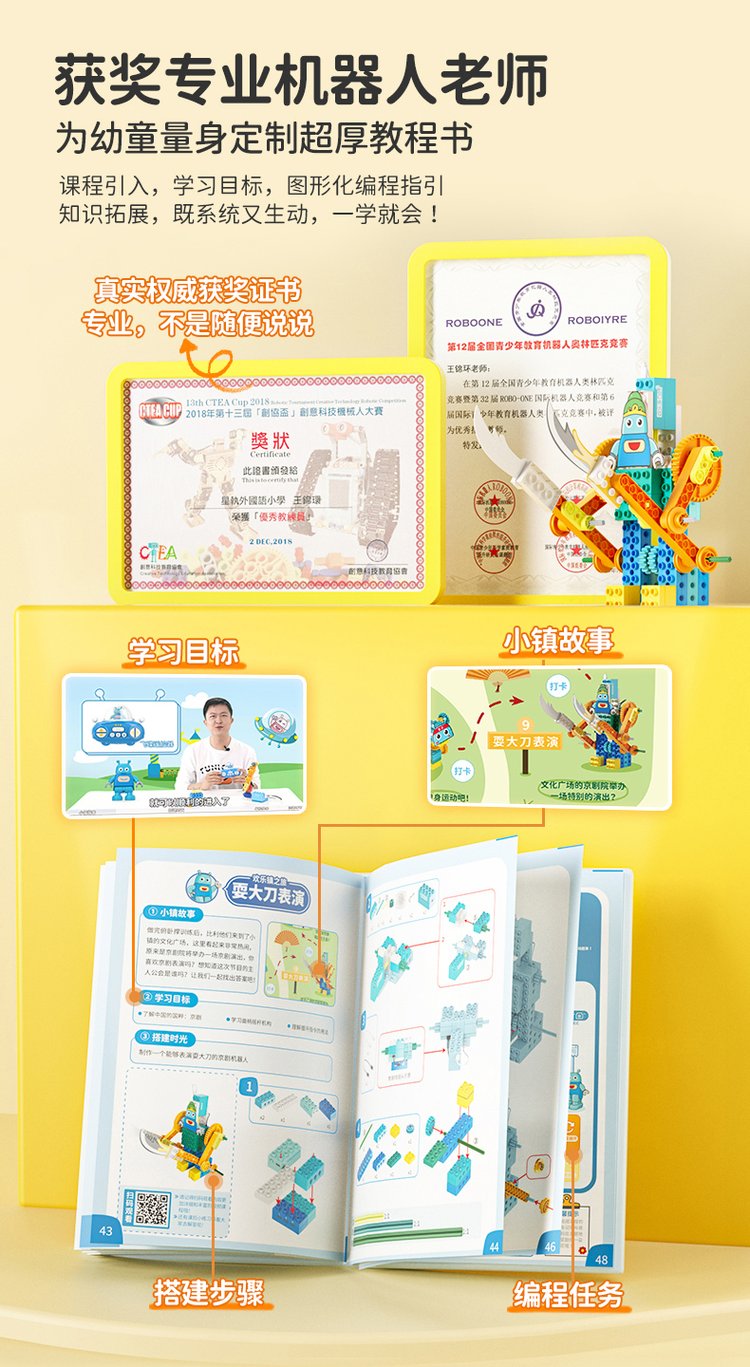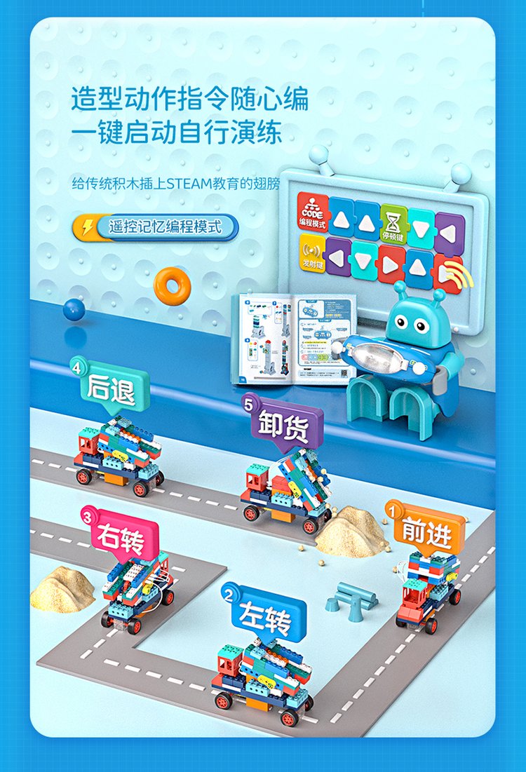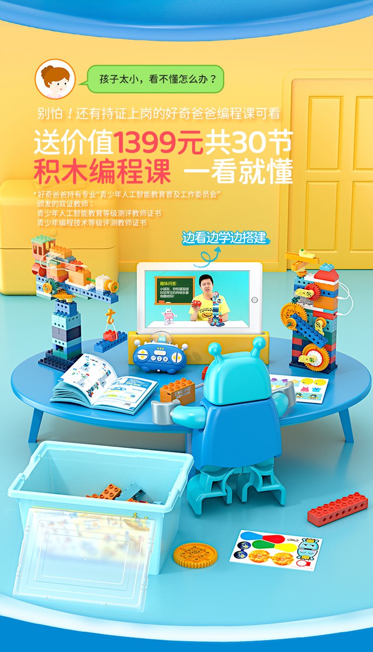 A joyful guy programming big granule toy robots in gear lessons, electric girls and boys