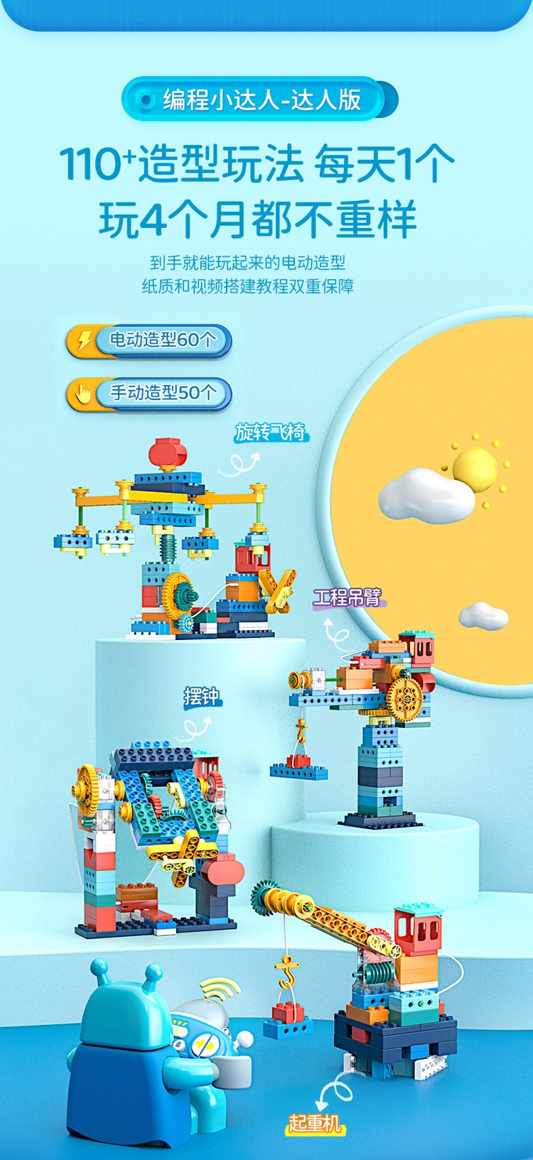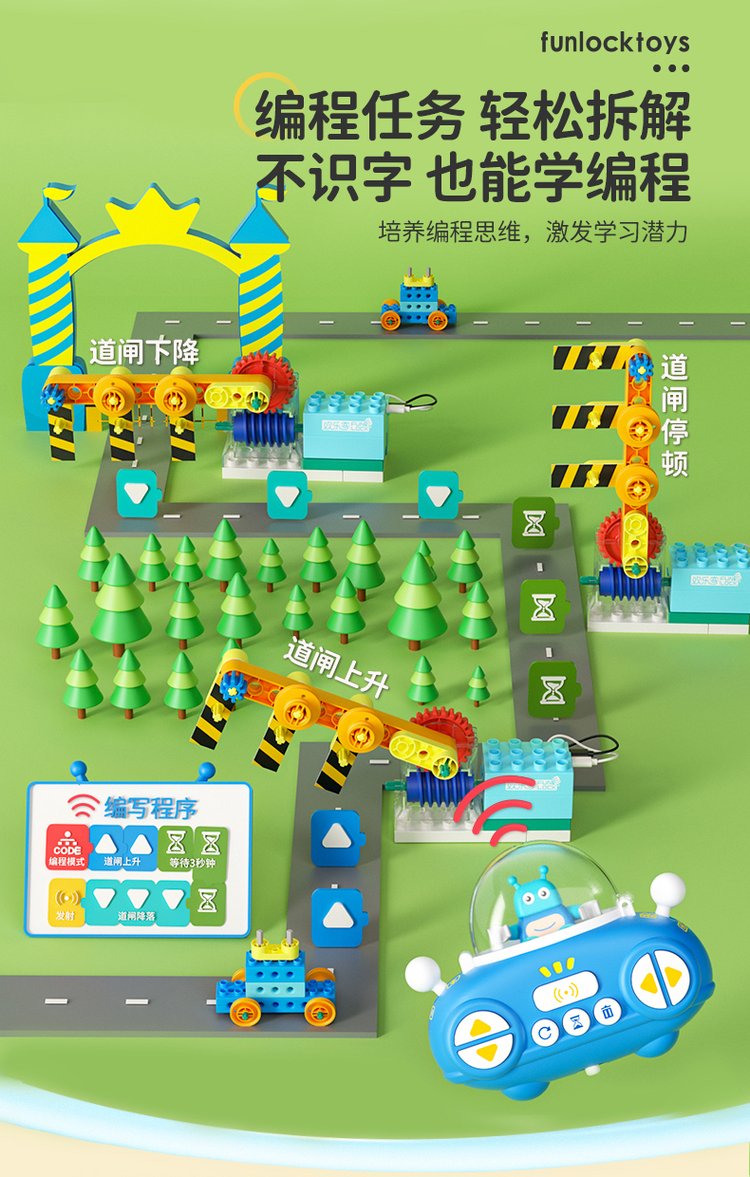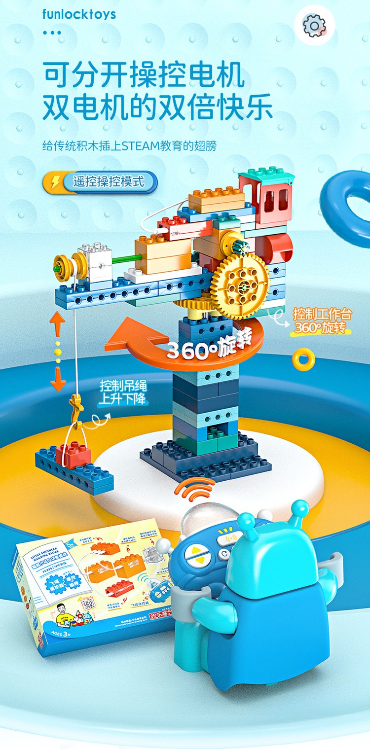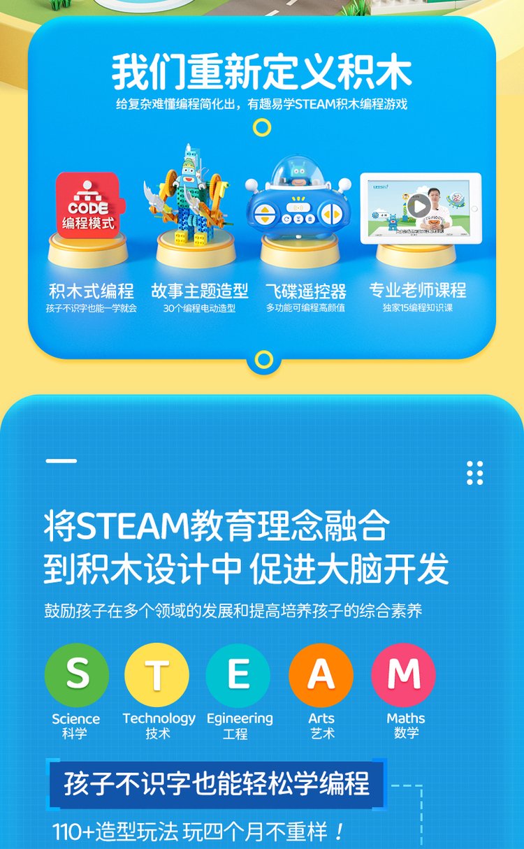A joyful guy programming big granule toy robots in gear lessons, electric girls and boys