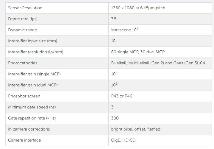 Iccd uses 18 mm image boosters with gen 2 and gen 3 photocathodes, 1 or 2 mcps to gain an increase of 104 to 106, and fibre-optic coupling to a ccd or cmos sensor with 1:1 defunct optics, providing 60 lp/mm resolution。
