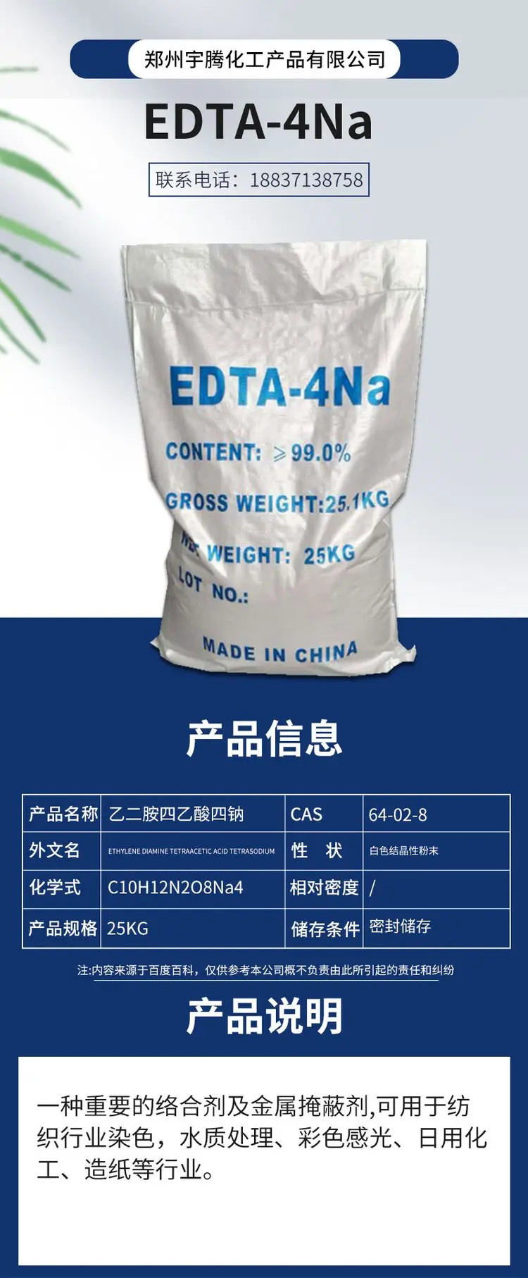 Edta tetradium, chemical reagents, slurry paper production, insoluble in common alcohol