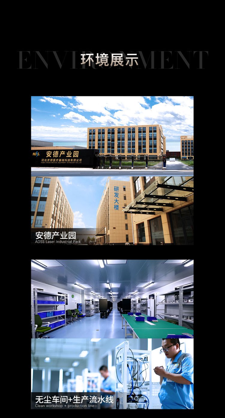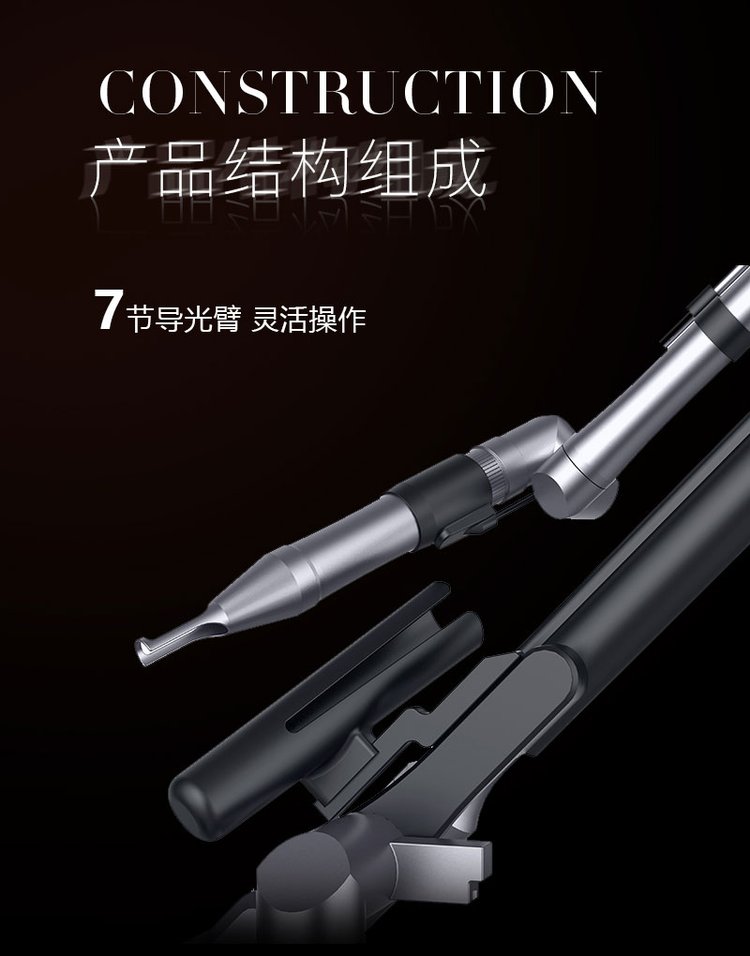 The product consists of the mainframe, the light arm, including the hand and head of the treatment, the foot switch, the power line, laser protection glasses