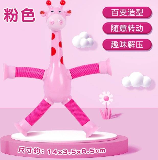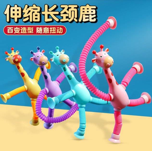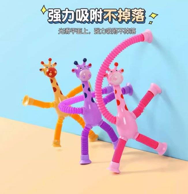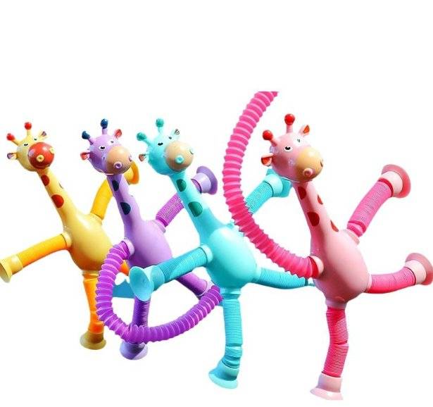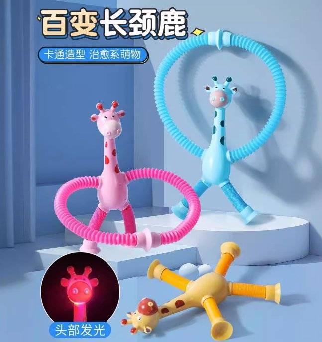 Suck-up giraffe robots stretching their toys, radiantly stretching out their children's cartoons, in