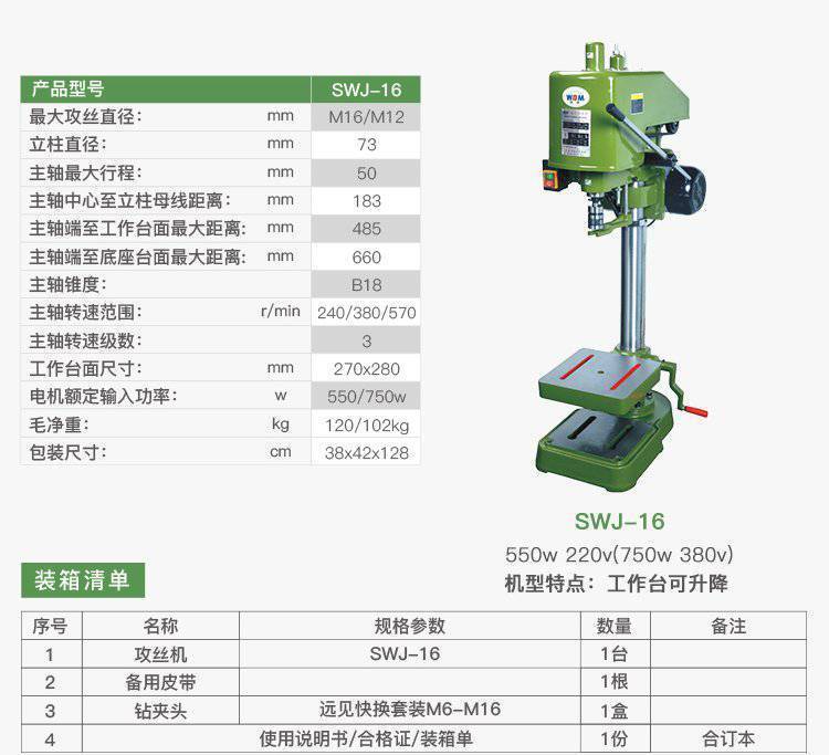 The swj-series filamental features 1. Are simple and operational; 2. The use of mechanical frictions to reverse the main axis has significantly improved the utility life of the electric power, its work is smooth, its noise is low and it has overload protection; 3. It can be used continuously and frequently in mechanical manufacturing, instrumentation, hardware tools, etc. The workstation may be tilted and the main axle boxes and workstations may be lifted or lowered。