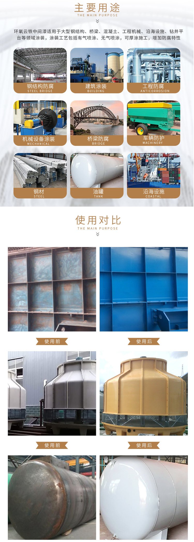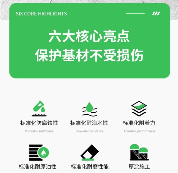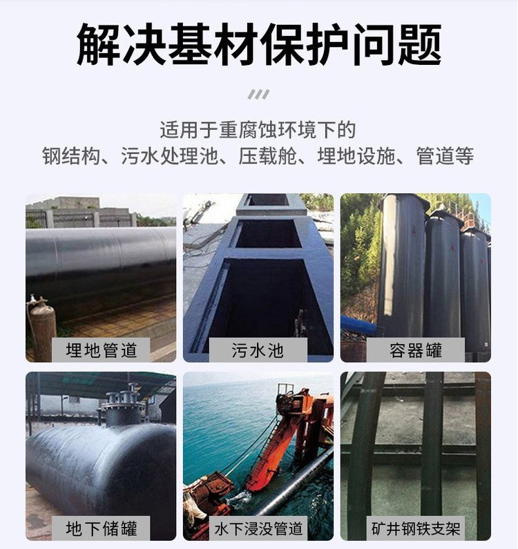 Steel structures, sewage treatment ponds, ballast tanks, burial site facilities, pipes, etc. Applicable in a highly corrosive environment