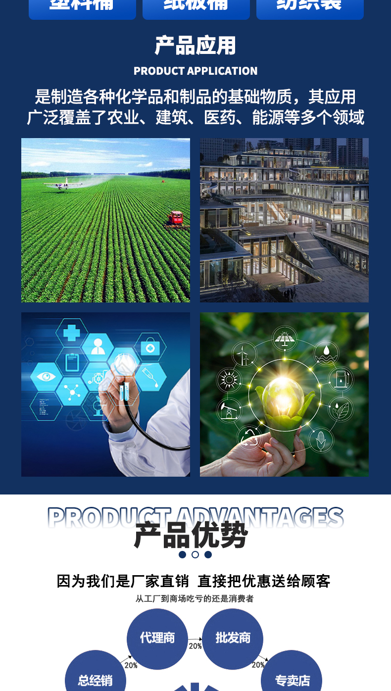 Mainly used in synthetic polyester fibres, resins, membranes, polyester paints and engineering plastics, etc