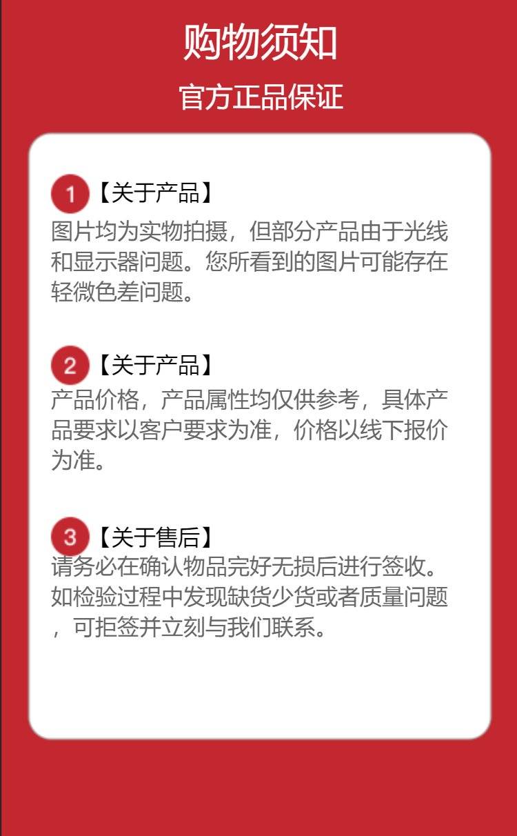 特别提示:商品详情页中(含主图)以文字或者图片形式标注的抢购价等价格可能是在特定活动时段下的价格,商品的具体价格以订单结算页价格为准或言是您与商家联系后协商达成的实际成交价格为准;如您发现活动商品价格或活动信息有异常,建议购买前先咨询商家。