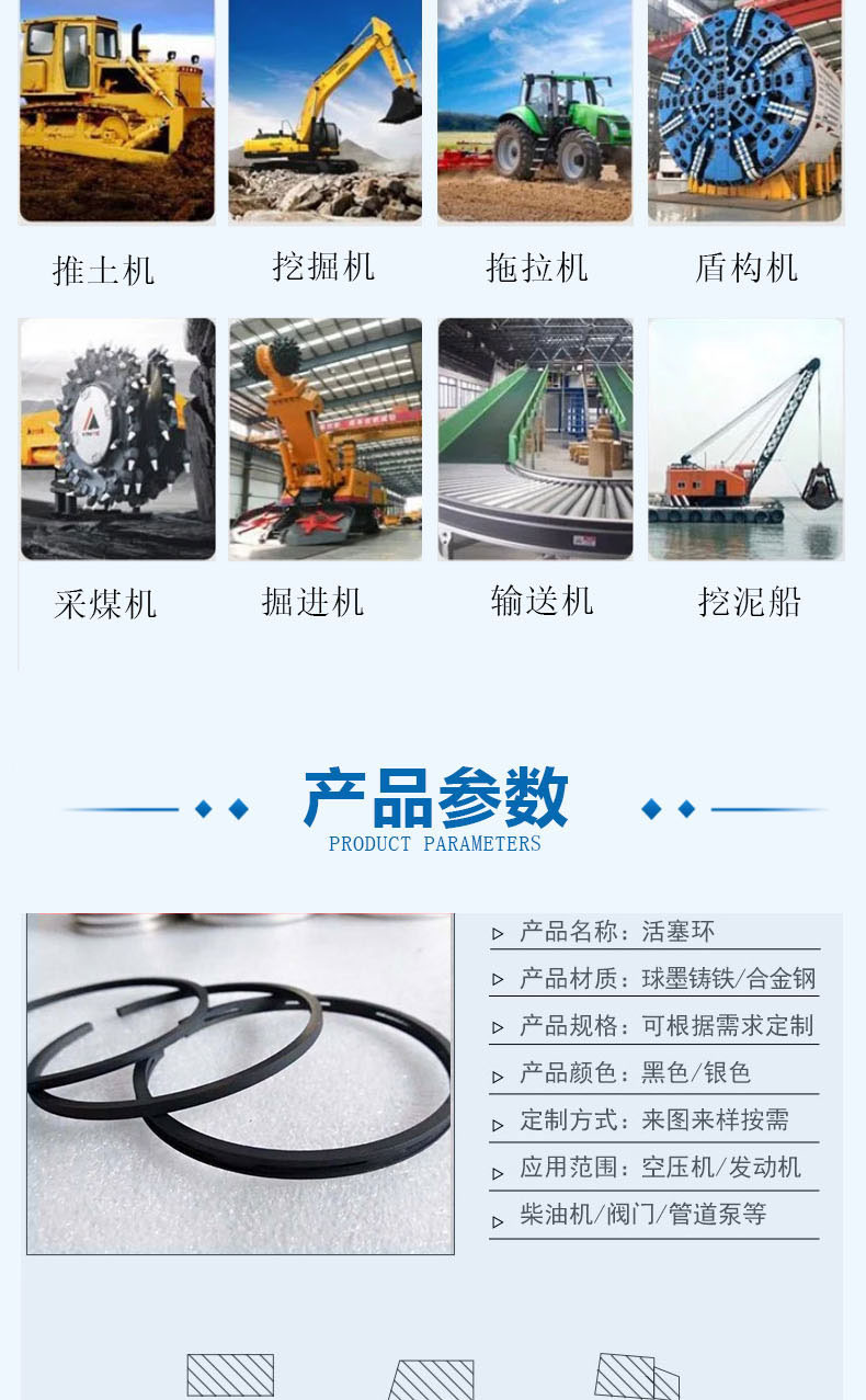 Pistol rings, boom rings, pistons, tank rings, seal rings