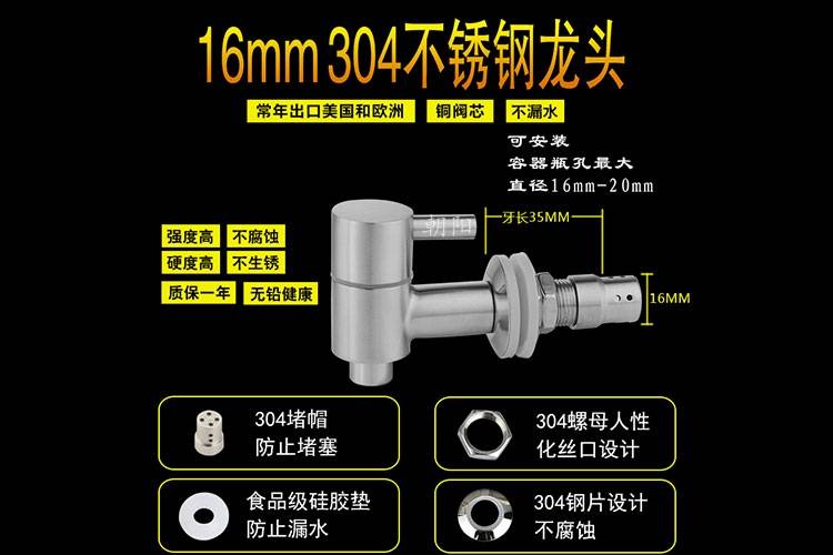 The stainless steel 304 wine bar taps have characteristics such as non-corrosion, non-retain and non-colour. Key non-chemical reactions, impregnated for wine, vinegar, water, lemon, alcohol or acid. Quality. I don't know