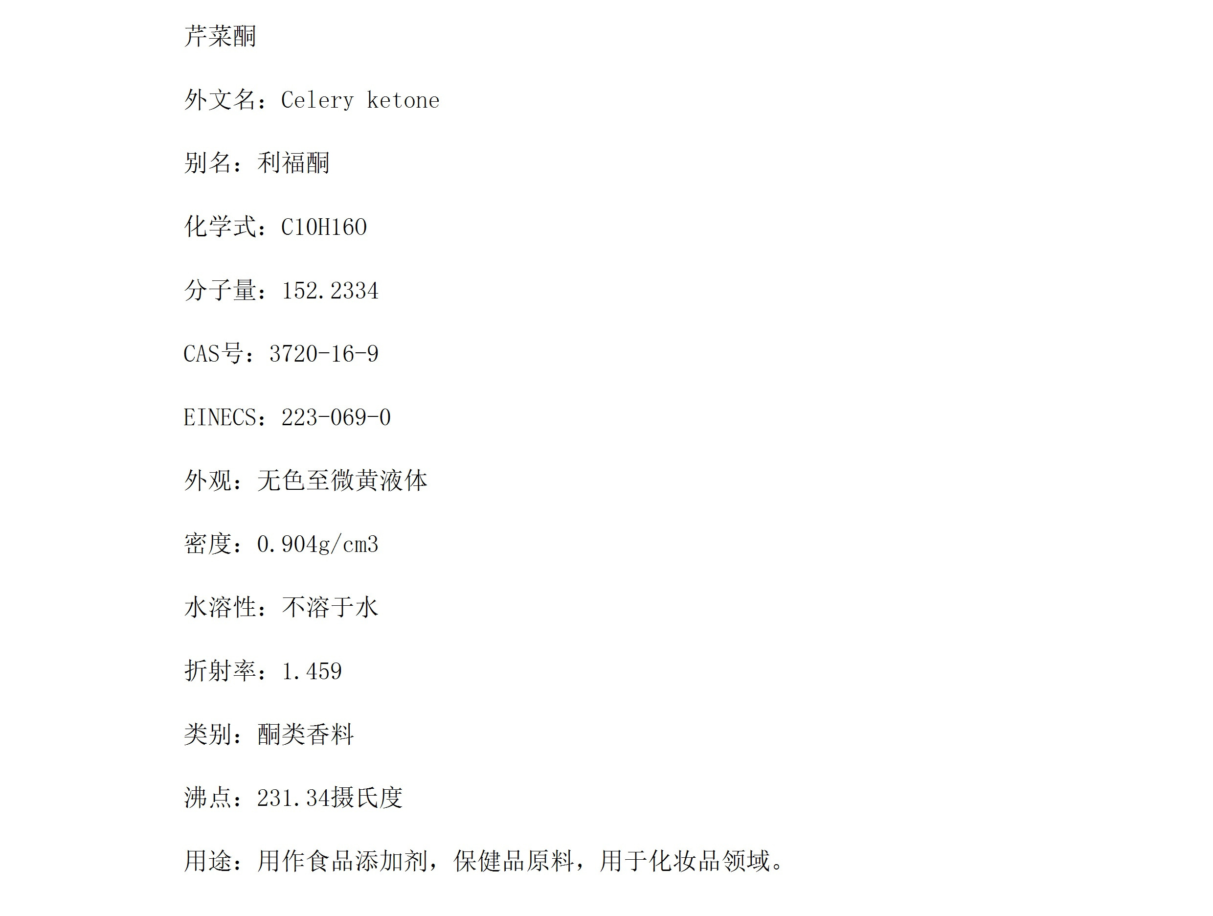 Celery ketone, lefodone, non-coloured liquid, ketone-like spices, food additives, makeup. Products