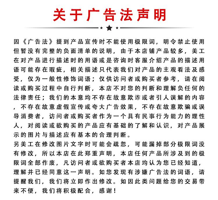 特别提示:商品详情页中(含主图)以文字或者图片形式标注的抢购价等价格可能是在特定活动时段下的价格,商品的具体价格以订单结算页价格为准或言是您与商家联系后协商达成的实际成交价格为准;如您发现活动商品价格或活动信息有异常,建议购买前先咨询商家。